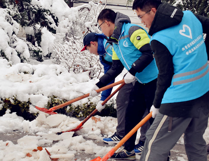 校学联的同学在校园里积雪较多的地方清扫。人行道、教室前和实验楼的道路上都可以看到一群群身穿校学联志愿服务马甲的同学在紧张的工作中。同时,校团委积极动员各级团组织带领团员青年在学院楼前和宿舍楼下等公共场所,清扫雪障,共建平安校园。