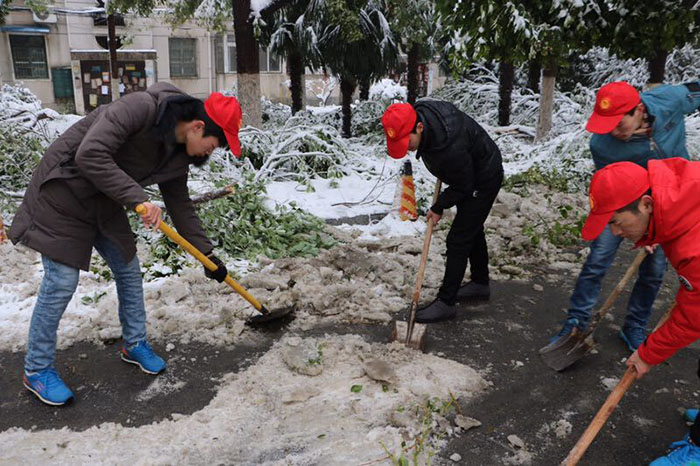 有的学生党支部还把扫雪开展成一次别具一格的党日活动,党员同学冲锋在前,积极参与义务清雪志愿活动,用自己最朴素的方式和最诚挚的热情践行党员先进性。药学院本科生两个党支部的党员同学来到学校西门主干道扫雪除冰。生命科学学院的党员同学扛起铁锹,一大早来到同学行走最困难的图书馆门前。