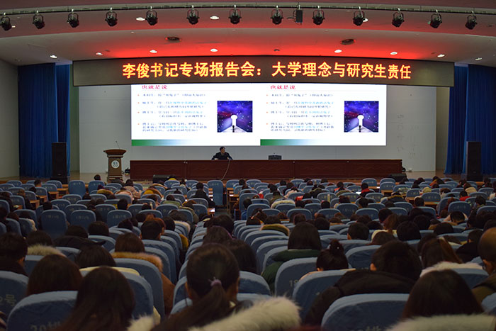 新年伊始,雪霁初晴。1月8日下午,校党委书记、博士生导师李俊教授在第一附属医院内科医技楼4楼报告厅为2017级研究生作题为《大学理念与研究生责任》的报告,引导研究生新生完成角色转换,认同大学理念,熟知医学进程,内化安医文化,不负时代重托。
