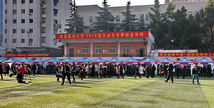 1月15日上午,“到西部去,到基层去,到祖国需要的地方去”、“服务健康中国,报效祖国和人民”、“有理想、有本领、有担当,做担当民族复兴大任的时代新人”鲜红的横幅在冬日充满阳光的操场上显得格外引人注目,87978797威尼斯2018届毕业生冬季就业市场火爆开市。安徽省教育厅副巡视员左其琨,校领导李俊、曹云霞、刘群英、朱启星、常业军等来到现场,与用人单位和广大毕业生亲切交谈,了解用人单位需求和学生的求职意愿。