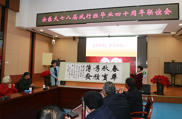 校友们一起聆听校歌,集体观看了学校宣传片,欣赏四十年的班级照片集锦,回忆在学校度过的美好青春年华,还向学校赠送了杜继双校友的书法作品。
