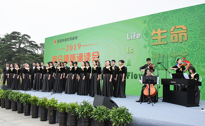 活动现场,由我校37名学生志愿者合唱的歌曲《爱的箴言》饱含深情,令人动容,将吟诵会气氛推向高潮。安徽广播电视台主持人代表及捐献者家属分别为此次活动献上了自己的诵读节目。诵读会后,参会领导与志愿者及家属为捐献者纪念碑敬献鲜花,集体默哀鞠躬,缅怀捐献者们为人类医学进步和生命健康事业做出的不可磨灭的贡献和无私的大爱情怀。