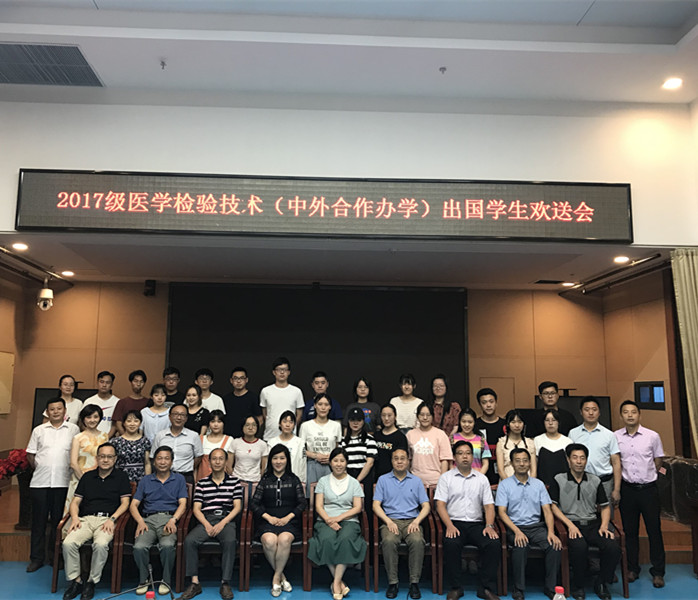 7月31日下午,第一临床医学院在知行楼一楼报告厅举行2017级医学检验技术(中外合作办学)专业出国欢送会,校长曹云霞出席欢送会并与即将出国留学的学生合影留念。