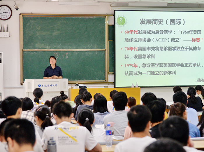 “铃铃铃……”8月31日下午2点20分,伴随着熟悉的预备铃声,身着深蓝色套装的短发女教授,准时迈入2017级医学影像学专业24-27班的教室。这天是新学期开学的第一天,也是她新学期《急诊医学》课程的第一课。