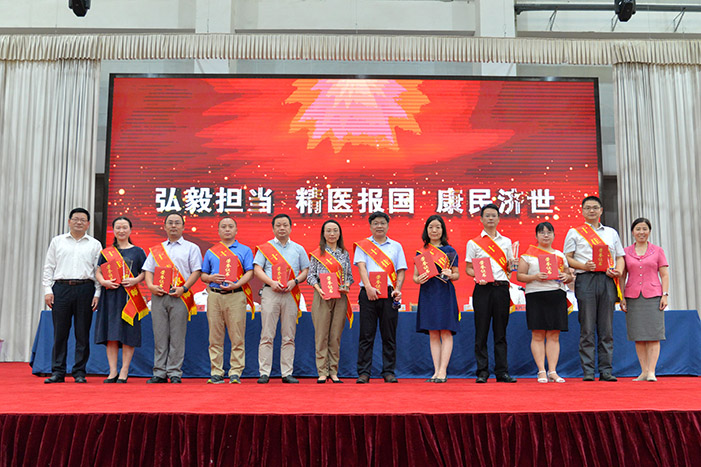 在全校及附属医院范围内评选出的2019-2020年度十佳教师、优秀教师代表、优秀教育工作者和“教学贡献新华奖”获得者在会上接受了表彰。会上还对近一年退休教职工代表及工作满35周年的在职教职工代表进行了表彰。
