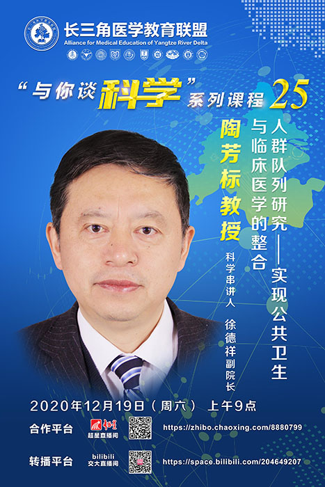 12月5日起,由长三角医学教育联盟发起的“与你谈科学”系列课程启动第八季。该系列课程邀请了长三角医学教育联盟十所高校的卓越医学基础科学家、知名学者和临床研究者组成“科学家梦之队”授课。系列课程第26课(第八季第三讲)由我校陶芳标教授讲授《人群队列研究——实现公共卫生与临床医学的整合》。12月19日(周六)上午9点,准时开讲。