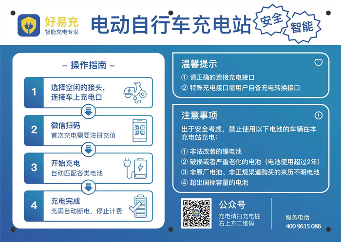 请驾驶电动自行车的师生按照智能充电桩提示进行操作(附使用说明),注意用电安全,完成充电后及时将车辆移出充电区,共同遵守校园非机动车管理规定,共同创建有序、安全的校园交通环境。