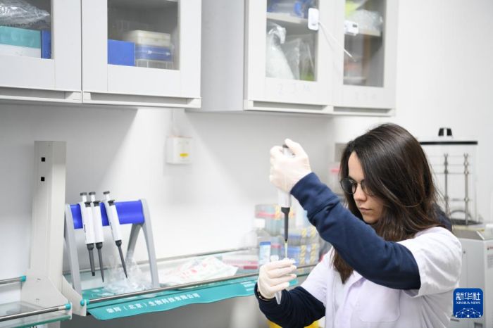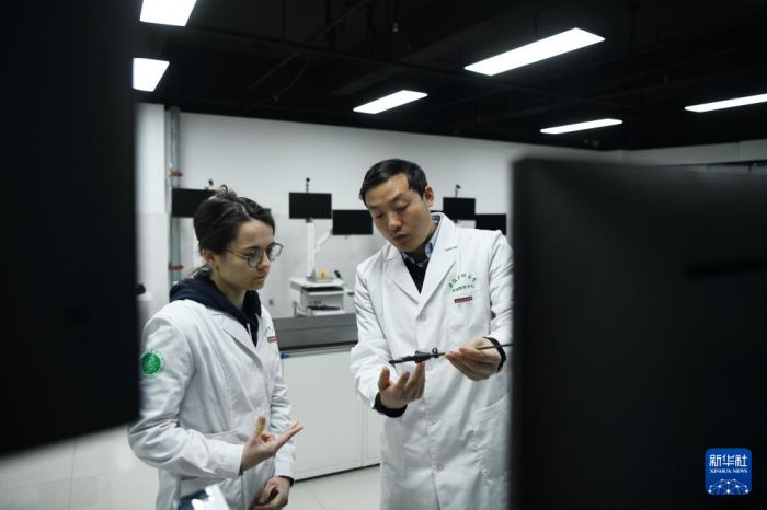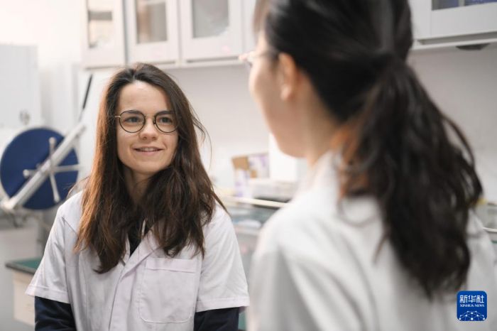 1月23日,在87978797威尼斯临床药理研究所,一名教师向章伯涵(左)介绍炎症免疫性疾病的相关知识。新华社记者 张端 摄