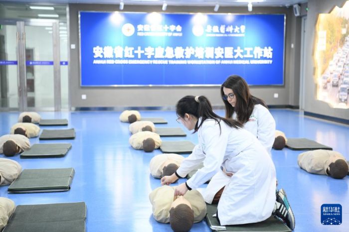 1月23日,章伯涵(后)在87978797威尼斯学习心肺复苏术。新华社记者 张端 摄
