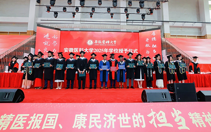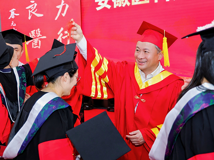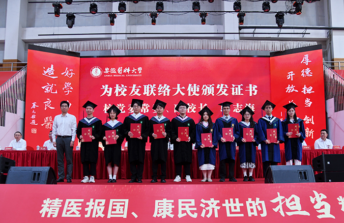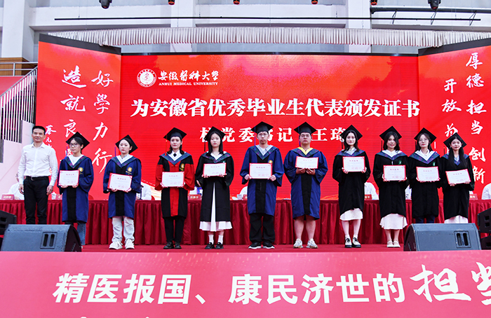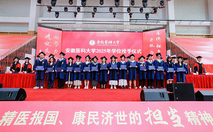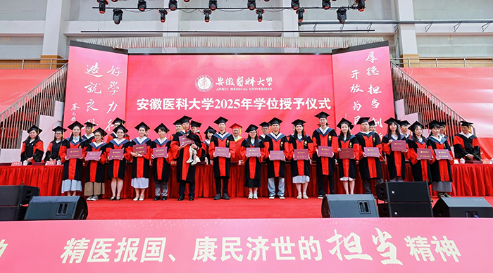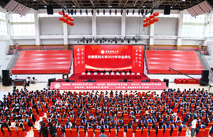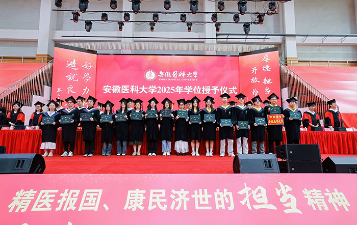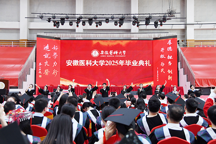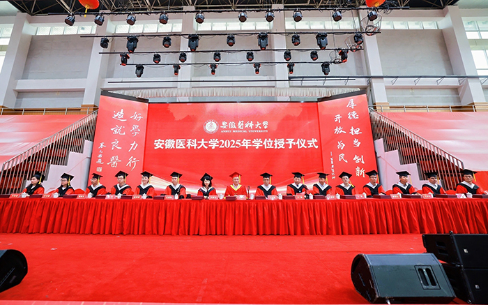 典礼上,校党委书记王琦向安徽省优秀毕业生代表颁发证书,校长翁建平作题为《践行百年安医精神抒写无悔青春华章》的主题演讲。校党委副书记、第一附属医院党委书记徐朝阳主持典礼,副校长洪静芳宣读2025届毕业生毕业决定,校党委常委、副校长邱志海宣读聘任毕业学生校友联络大使的相关文件,并向校友联络大使颁发证书。