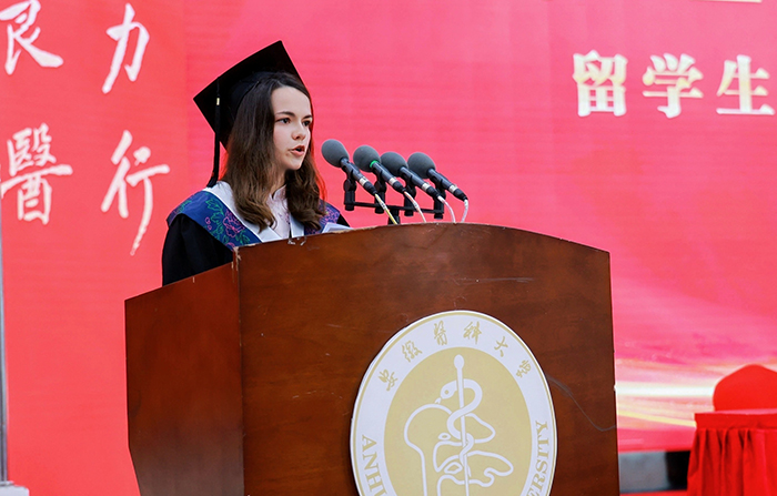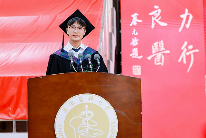 来自第一临床医学院(第一附属医院)的陶博睿、张雨阳,国际学院的章伯涵,分别作为本科生、研究生、来华留学生毕业生代表发言。