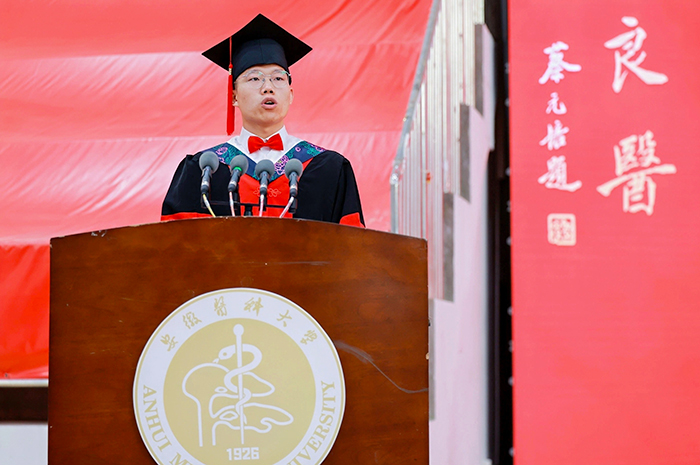 国家级青年人才称号获得者、精神卫生与心理科学学院副院长许尹教授作为教师代表发言。他回忆了与学生相处的点滴,为他们以永不言败的精神,在学习、科研、生活等方面取得的成绩感到骄傲。他希望广大毕业生都能怀揣医者仁心、永葆求知恒心、恪守从医初心,在未来的道路上努力践行“健康所系,性命相托”的神圣誓言,勇往直前,实现人生目标。