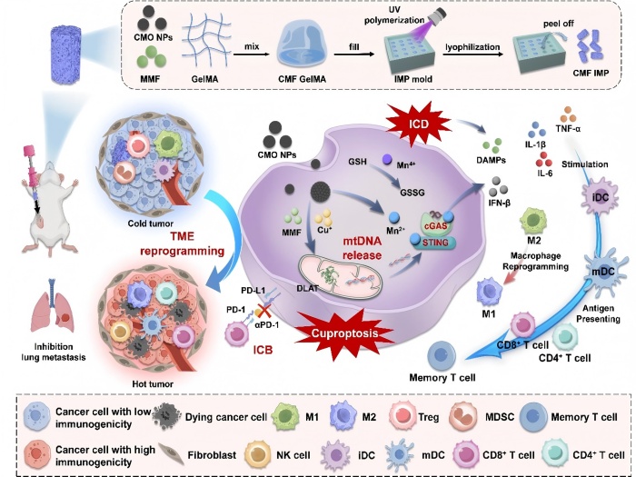 钱海生教授团队在临床活检取样的启发下,开发了一种基于穿刺针输送的可降解肿瘤植入剂。植入剂由光交联的甲基丙烯酰明胶作为底物,可以有效装载Cu0.5Mn2.5O4纳米颗粒(CMO NPs)和富马酸单甲基(MMF)。在体内,植入剂在金属基质蛋白酶的作用下逐渐降解并缓慢释放药物。植入剂中加载的CMO NPs诱导癌细胞铜死亡并与MMF协同触发线粒体损伤,促进mtDNA释放。释放到细胞质中的mtDNA随后通过与Mn2+配合激活cGAS-STING通路,触发先天免疫应答。此外,CMO NPs通过诱导免疫原性细胞死亡(ICD)释放损伤相关的分子模式(DAMPs),并促进树突状细胞(DC)成熟。cGAS-STING介导的先天免疫与ICD激活的适应性免疫协同作用,显著增加肿瘤微环境中CD8+T细胞浸润及相关炎症因子水平。在动物实验中,CMO NPs通过调整肿瘤组织中PD-1和PD-L1的水平显示出与antiPD-1的协同治疗作用。