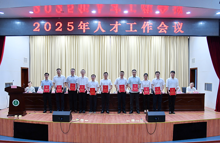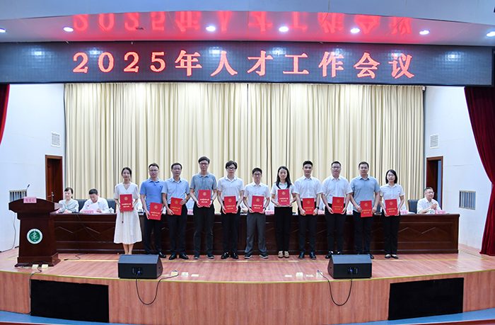 与会校领导为2025年青年后备人才和“引才大使”代表颁发证书和奖杯。